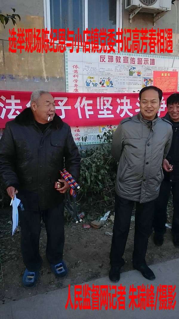 图:小店镇党委书记高芳春前来选举投票现场与陈纪恩相遇各怀“心事”