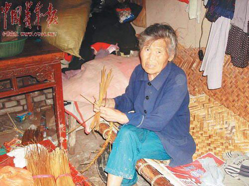 9月7日上午,张振风的母亲正在编织草帽辫。她的丈夫不愿对记者多说。(记者 刘万永/摄)