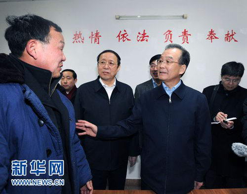 1月24日,中共中央政治局常委、国务院总理温家宝前往国家信访局,与来访群众进行面对面交流,了解他们的困难和要求,并就政府工作听取意见。这是在信访局接待室,温家宝总理向河南省博爱县来访人员陈国安询问来访缘由,并叮嘱信访局接谈人员要认真做好记录,按程序做好接待办理工作。新华社记者李涛摄