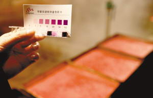 工商执法人员通过甲醛快速检测色阶卡,测出血旺含有大量甲醛。