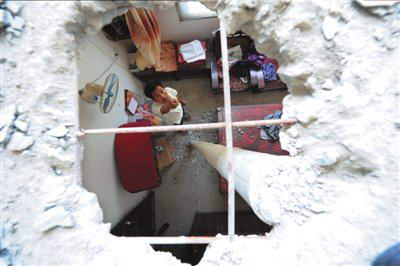 该小区安置房有多层楼房和两层连排楼房等不同户型,出现质量问题的主要是连排楼房。居民刘成旺家是质量问题最严重的一户。他家二楼的主卧室,石灰和混凝土散落一地,屋顶已经出现了一个脸盆大小的窟窿,稍一用力就可掰下一块混凝土块,碎块可以直接捏碎。