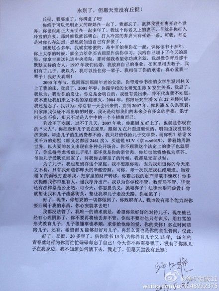 在微博中,记者看到一张用A4纸打印的遗书。上面写道:“丘挺,我走了,你满意了吧!”跳楼女子娓娓道出了在这16年的婚姻里,她曾花钱供他读书,看着他步步高升,又看着作为教授的他,多次与与多位女学生发生关系,千万别墅、百万途锐……还有太多说不清楚的,称自己已被一步步逼上绝路,只求丘挺可以善待儿子。