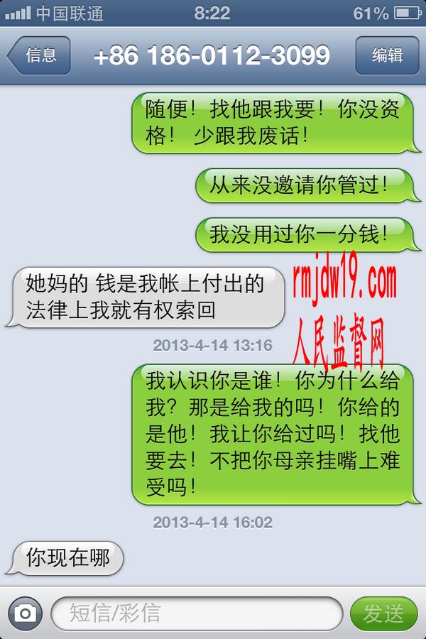 图:中南海高官范悦、浙商金忠等人向纪英男讨债的短信截图