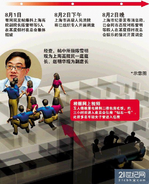 8月2日晚,上海市纪委市监察局官方微博发布消息,承认上海市高院有四位法官涉嫌在衡山度假村夜总会进行娱乐。当日,官方确认,涉事的四名法官中,有两位是爆料视频中已经提到的高院民一庭庭长陈雪明,及副庭长赵明华。