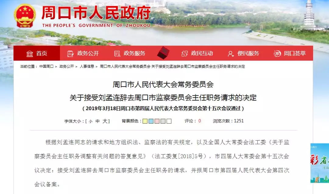 值得一提的是,3月19日,周口市政府网站报道:根据刘孟连同志的请求和地方组织法、监察法的有关规定,以及全国人大常委会法工委《关于监察委员会主任职务调整有关问题的答复意见》(法工委复[2018]5号),市四届人大常委会第十五次会议决定:接受刘孟连辞去周口市监察委员会主任职务的请求,并报周口市第四届人民代表大会第四次会议备案。