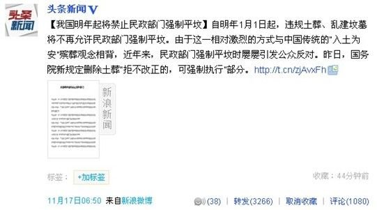 据媒体报道,11月16日国务院第628号令要求对《殡葬管理条例》第二十条进行修改,新规定删除了“拒不改正的,可以强制执行”部分。即自明年1月1日起,违规土葬、乱建坟墓将不再允许民政部门强制平毁。很快,此条新闻就在一部分敏感的网民群体中扩散开来,网友“儒士社崇德学堂”为之叫好,“好哇,周口平坟官方总算被国务院赏了两个耳光,打得及时。”
