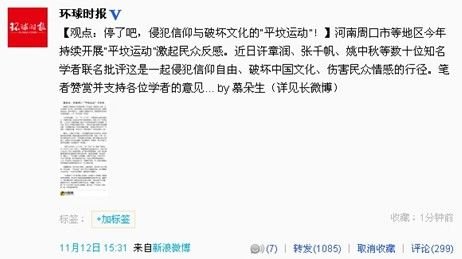 《环球时报》在其官方微博上对周口“平坟运动”发表观点,称其“侵犯信仰”且“破坏文化”。之后又在报纸上发表旅美学者文章《河南周口“平坟运动”可休矣》,文章认为“平坟运动”涉及千家万户情感和利益,至少需要举行社会听证,广泛征求各界意见,避免官民矛盾激化。