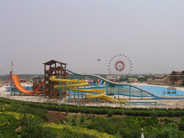 距离苦池水库一公里外,记者看到美天游乐园巨大的摩天轮矗立在水库中心。进入游乐园,记者发现在这个有16层楼高的摩天轮下,有海盗船、极速飞碟等各式各样的陆地游乐设施。此外,还有以300米长的漂流河、3000平方米的造浪池和水上冲浪为主体的“晋秦豫最大的水上世界”,其占地30亩。