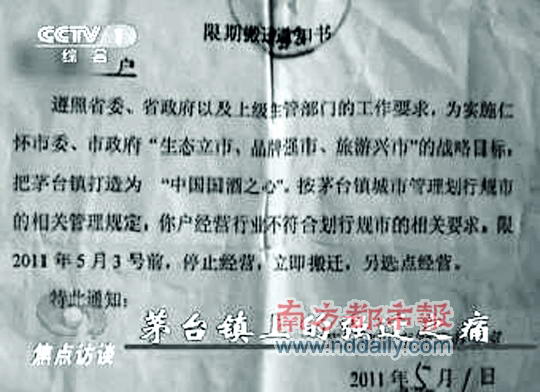 南都讯 据中央电视台《焦点访谈》5月15日报道 5月1日,贵州省仁怀市茅台镇给环茅南路的非酒类商户下发通知,要求他们3日内搬迁,称要建“白酒品牌展示一条街”。此事引起商户不满。