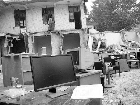 在现场,只见两个工商所的所有办公桌椅、电脑、铁皮柜、单位招牌及商户档案均在露天晾晒,两个工商所办公的二楼6间房屋东头三间被彻底拆除完毕,二楼楼梯也被砸掉,剩余的3间房成了危房,房屋内空无一物。