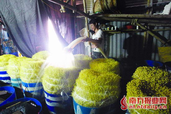 东莞东城主山大塘头松毛岭南区四巷有家生产豆芽的作坊。本报记者多日暗访发现,该作坊使用增白剂、无根素、增长素等多种化学药物催熟豆芽。而该作坊每天生产两三千斤豆芽,送往东莞城区最大的蔬菜批发市场莞城细村蔬菜批发市场以及多个市场。近1/3的豆芽送往某大型超市的配送中心。