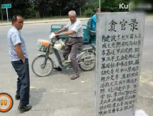 在张秀芳老人的院子里,一块一米多高的石碑格外显眼。石碑上刻着14个大字“劝君莫入贪官录,人间正道是沧桑”。张秀芳老人告诉记者他们一共立了两块贪官碑,一块暂时放在他们院子里,而另一块放在了自己门外的路边上。记者数了一下两块贪官碑上一共有65名贪官的名字,而张秀芳老人告诉记者他们贪官笔记上的贪官数目远远超出了这个数字。