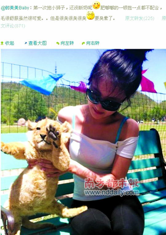 尽管郭美美删除了微博,但该条微博内容已经流传开去,网友开始向同在微博上的翁涛求证。下午5时12分,郭美美再次出现,她转发了网友“隔空氜紀”的一条评论,并说:“明白事理的人还是有的。”7月4日,一位名叫“我就是个爆料的小号啊”的网友发微博称,2011年5月21日,在野生动物园拍到一名年轻男子为郭美美拍照,并配发了一组照片,照片上一名年轻男子正用手机为抱着一只小狮子的郭美美拍照,5月21日郭美美在自己微博上也发表了相同场景中抱着小狮子的照片。7月5日下午2时35分,“隔空氜紀”评论了这条微博说:“这个太强啦!我就说么,郭美美肯定是有正常的男朋友,不是那个六零后老男人!更不是五零后的老天蝎!”郭美美评论和转发的微博正是这条。2时52分“隔空氜紀”再次说,照片是偶然拍到的,之后就放在相机里没整理,现在才看到这些照片,奇怪的是,“我就是个爆料的小号啊”、“隔空氜紀”和郭美美随后都删除了该内容的相关微博。