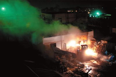 数十名工作人员在院内进行相关处置工作。前晚11点多,一辆大型铲车开入,铲车司机佩戴了呼吸面罩,一名消防员坐在司机旁边指导作业。随后,这辆铲车将彩钢板房推倒,并将已经准备好的沙土覆盖在指定位置。昨天凌晨零点32分,整个抢险工作结束。