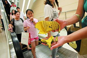昨天下午,一儿童在朝阳大悦城商场乘扶梯时凉鞋被夹碎,其母在出事电梯前展示被夹碎的凉鞋。商场物业一员工称,扶梯本身并无问题。事发电梯—西子奥的斯电梯厂家相关负责人表示,朝阳大悦城3部飞天扶梯,由该公司负责维保,近期均有检修,未发现任何问题。记者 王贵彬 摄