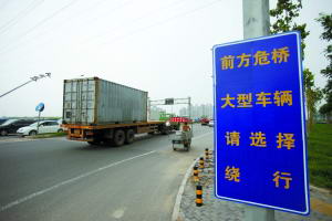 “前方危桥,大型车辆请选择绕行。”近日,连接通州马驹桥镇与亦庄的马驹桥新桥桥头,竖起了两块这样的提示牌。建成于2005年的该桥,去年桥面曾两次出现裂缝,开通6年即成为危桥。路政部门表示,将于近期大修桥面,在此之前竖立提示牌,以防该桥问题进一步扩大。