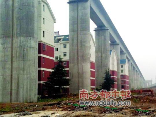 昨日上午9时12分,网友“幸运的幽忧”在微博上发布了一张照片:一座在建的高架桥伸向远方,下面,4栋7层楼房与高架桥靠在一起,高架桥在其中两栋楼楼顶横跨过去,巨大的桥墩就横在楼房之间。