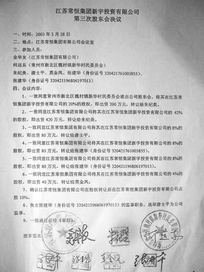 据调查,上述的第三次股东会议决议中称,2003年3月28日在常恒集团会议室召开了股东会议。但据记者核实,此次会议并未召开,而是由与金华友亲近的一位办公室秘书拿着已经拟好的股权转让协议挨个找相关人员签了字。