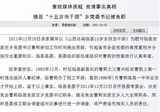经审查核实,1993年12月,时任临县副县长的曹莉之父曹兴旺在曹莉上高一时违反组织人事纪律,给曹莉办了招工手续;直到1996年7月曹莉在临县一中毕业后才开始上班。