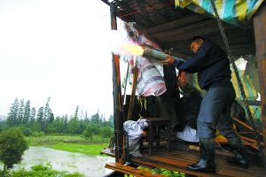 6月8日,杨友德爬上自己的“炮楼”,演示自制土炮的使用方法。吴江 摄