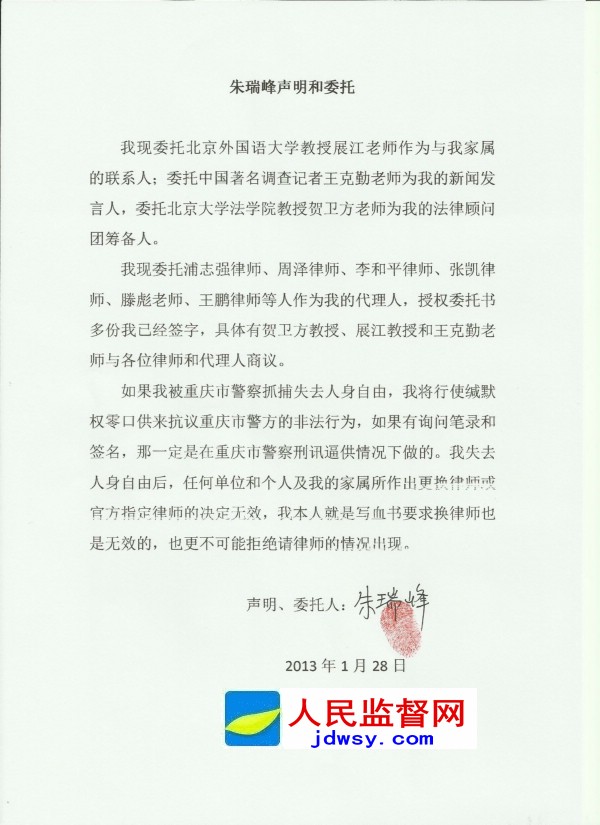 朱瑞峰声明和委托 我现委托北京外国语大学教授展江老师、中国著名调查记者王克勤老师作为与我家属的联系人;委托北京大学法学院教授贺卫方老