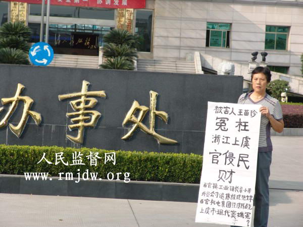 王苗珍入狱,丈夫抑郁致死,家产被封。2004年,王苗珍提前出狱后,开始了漫漫的上访长路,长年奔波于省城和上虞县之间,省、市法院已经意识到这是个冤案,但要引正错误何其艰难?2008年9月25日,王苗珍再次来到省高法,法官陈汉美无奈地说:“我们已驳回你的申诉,你去最高法院去告吧”。王苗珍,一个63岁的老太太,曾经风光一时的人物,此时已形如枯稿,不知道她的上访路还有多远?