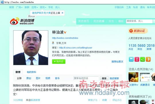 人民日报甘肃分社社长林治波在微博中以“刚刚收到的消息”的形式发布了刘军免职的消息。