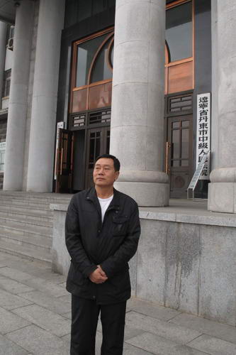 冷国府在丹东市法院门口,他一直在等待弟弟冷国权贩毒案重审开庭的日子。