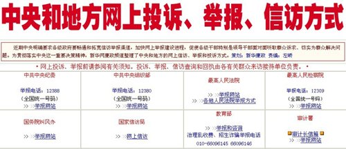 根据上半年中央明确要求各级政府要畅通和拓宽信访举报渠道,加快网上举报建设进程的精神,新华网廉政频道整理了中央和地方的网上信访、举报和投诉方式,截至目前群众反响热烈,收效明显。