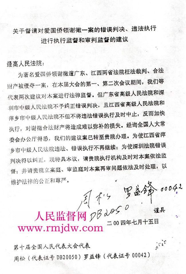 深中院和江西萍鄉中院不顧事實和法律,錯誤查封該房産并且劃扣了租金,其行爲不但嚴重的侵犯了謝的合法權益,也極大的削減了海外愛國人士在國内投資、報效祖國的熱情。我會特向您反映此事希望領導您在百忙之中過問此案,向中國高院反映對深圳中院的錯誤裁決進行糾正,督促深圳中院和萍鄉中院把違法劃扣的租金及拍賣謝私人的财産依法返還給謝,使本案得到圓滿的解決。