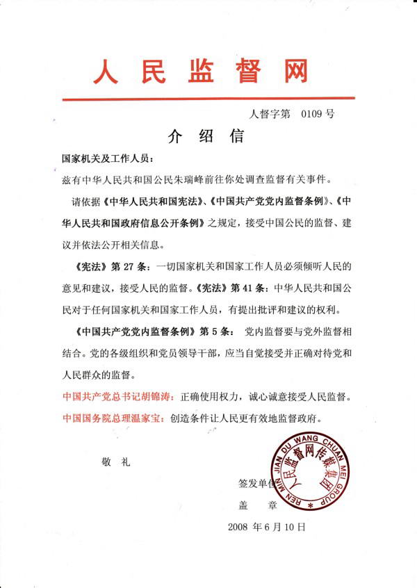 朱瑞峰在政法系统也算摸爬滚打好多年,早就养成了这种职业习惯。按照记者的行规,正式采访得有“介绍信”。对于单枪匹马的“人民监督网CEO”,这“介绍信”到哪去弄呢?