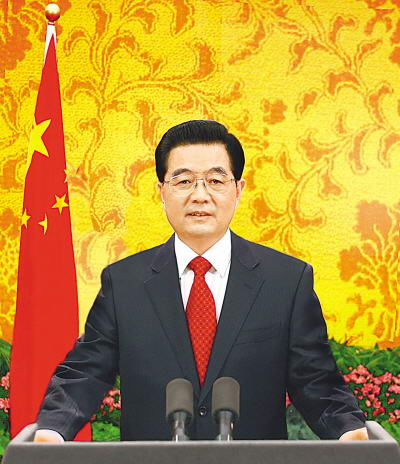 新年前夕,国家主席胡锦涛通过中国国际广播电台、中央人民广播电台和中央电视台,发表题为《共同推进人类和平与发展的崇高事业》的新年贺词。新华社记者 鞠 鹏摄