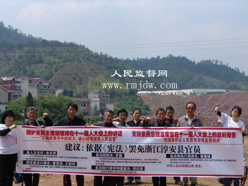 2008年5月10日,浙江省淳安县千岛湖风景区众位公民打着横幅——建议:依据《宪法》罢免浙江淳安县官员。此和平倡议持续了大约一个小时。