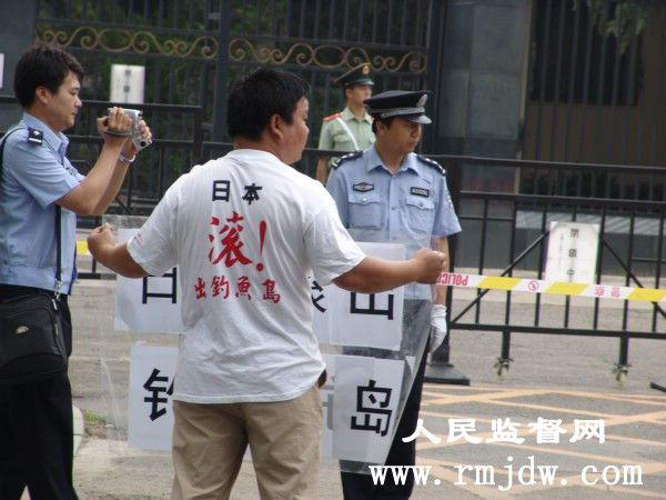 人民监督网讯 (记者 朱瑞峰)2008年6月18日下午,中国15名公民在日本使馆前和平示威,抗议日本舰艇撞沉中国台湾渔船。整个过程持续了半个小时。