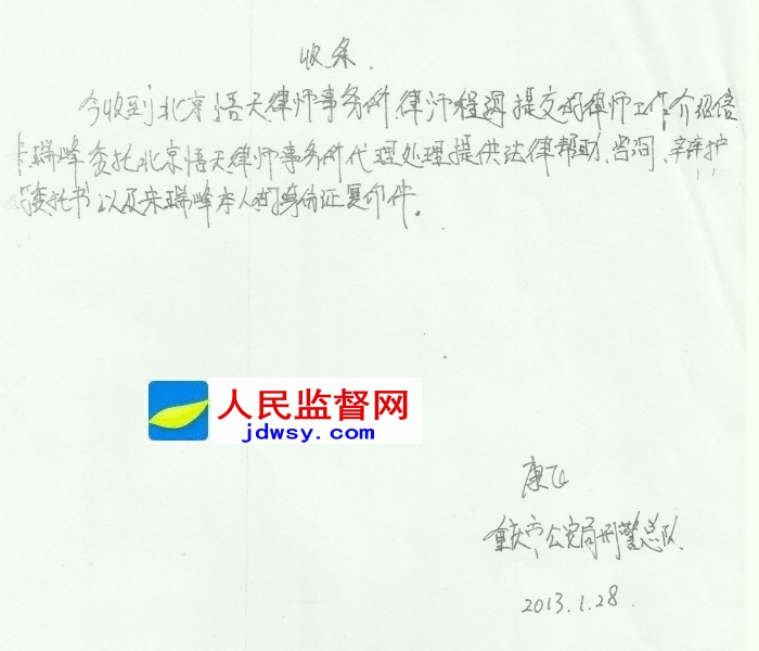 6、程海律师递交重庆警察的律师介绍信和委托书,康辉出具的收条签名为“康飞”,与警察证上的姓名不符,虚假签名违法。