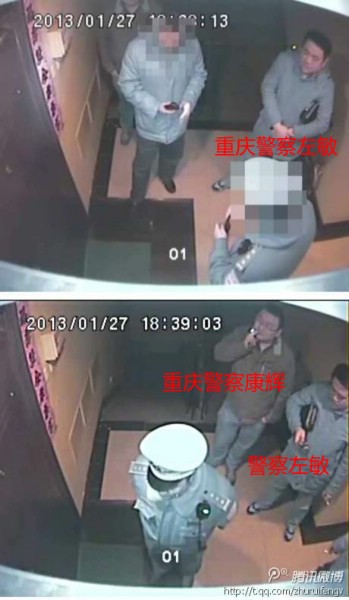 20131271827分,朱瑞峰位于北京市西城区德外派出所辖区内住宅门口先后来了5个人,声称是警察,要向他了解有关情况,没具体说明要了解什么情况,其中两人是重庆口音。因为无法核实来人身份,晚上开门存在很大危险,当天又是法定假日(周日)需要休息,朱瑞峰要求他们立即撤离,说如需了解情况请到德外派出所谈。这些人拒不撤离,仍不断敲击朱瑞峰家防盗门、按门铃,多次大声喊话。朱瑞峰感到非常紧张和恐惧,以为重庆警察要来抓自己抢夺手中部分重庆官员不雅照录像。无奈,朱瑞峰将此事紧急发布在新浪等4大门户网站的微博,向广大网友和各大媒体同仁、著名学者求救。在网络舆论的强烈谴责下,来人要求朱瑞峰必须第二天到北京市德外派出所谈话,才于2253分撤离。朱瑞峰家门外的录像资料显示,警察在朱瑞峰家门外共3小时28分钟。