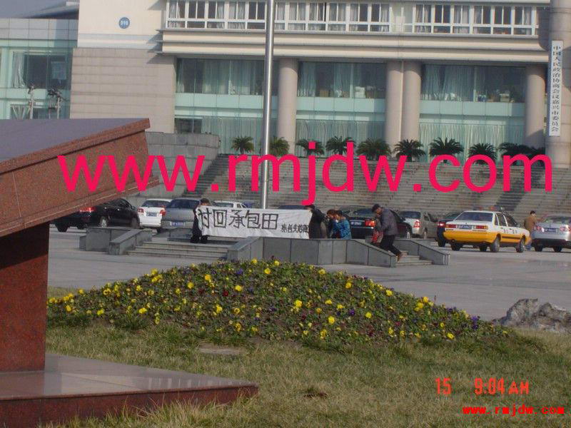 2月15日是嘉兴市政府信访接待日,清晨,我们嘉善县八个农民不约而同乘上6时30分的头班公交车,从嘉善县赶往嘉兴市区。一路上,我们互诉冤情,才知道都是上访人,都是为讨要承包田而来,就相约到市政府向国旗下跪、讨田、诉冤。